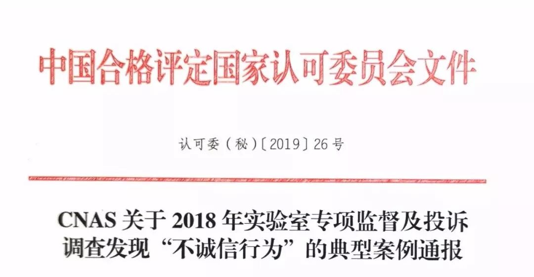据中国认可今日消息,中国合格评定国家认可委员会(CNAS)发文,通报2018年专项监督和投诉调查工作中发现的不诚信行为典型案例。详情如下:
